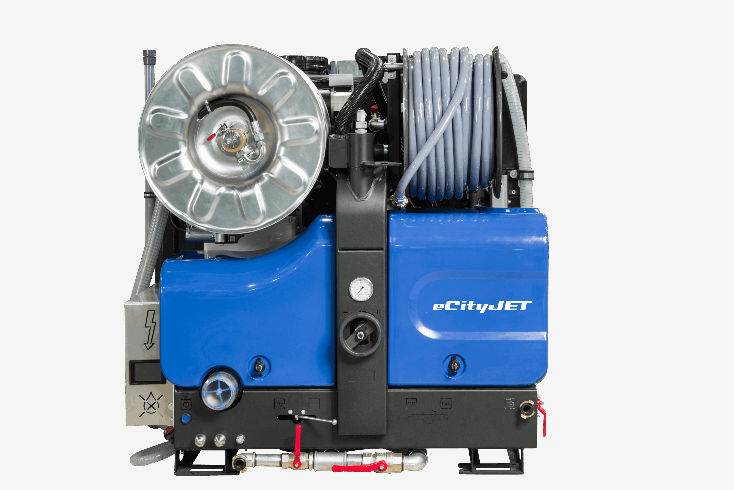 The fully electric CityJet jetting machine uses state-of-the-art technology, and features a strong electric motor powered by an extremely efficient battery pack. This means the machine produces zero emissions, which makes the eCityJet ideally suited as a van-pack for use in city centres where strict emission requirements apply and in areas that are completely or partially enclosed. The eCityJet has all the features of a conventional diesel-driven van-pack machine and is only marginally heavier. The empty jetting machine weighs approximately 690 kg.